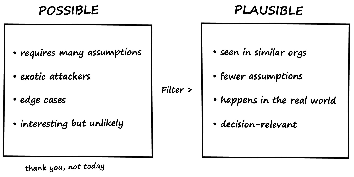 This is Ockham’s Razor applied to risk analysis. Favor the explanation that makes the fewest assumptions. If a scenario requires multiple unlikely events to align just right or assumes sophisticated attackers for a very typical target, it probably belongs lower on your list. You are not trying to impress anyone with complexity. You are trying to be useful.